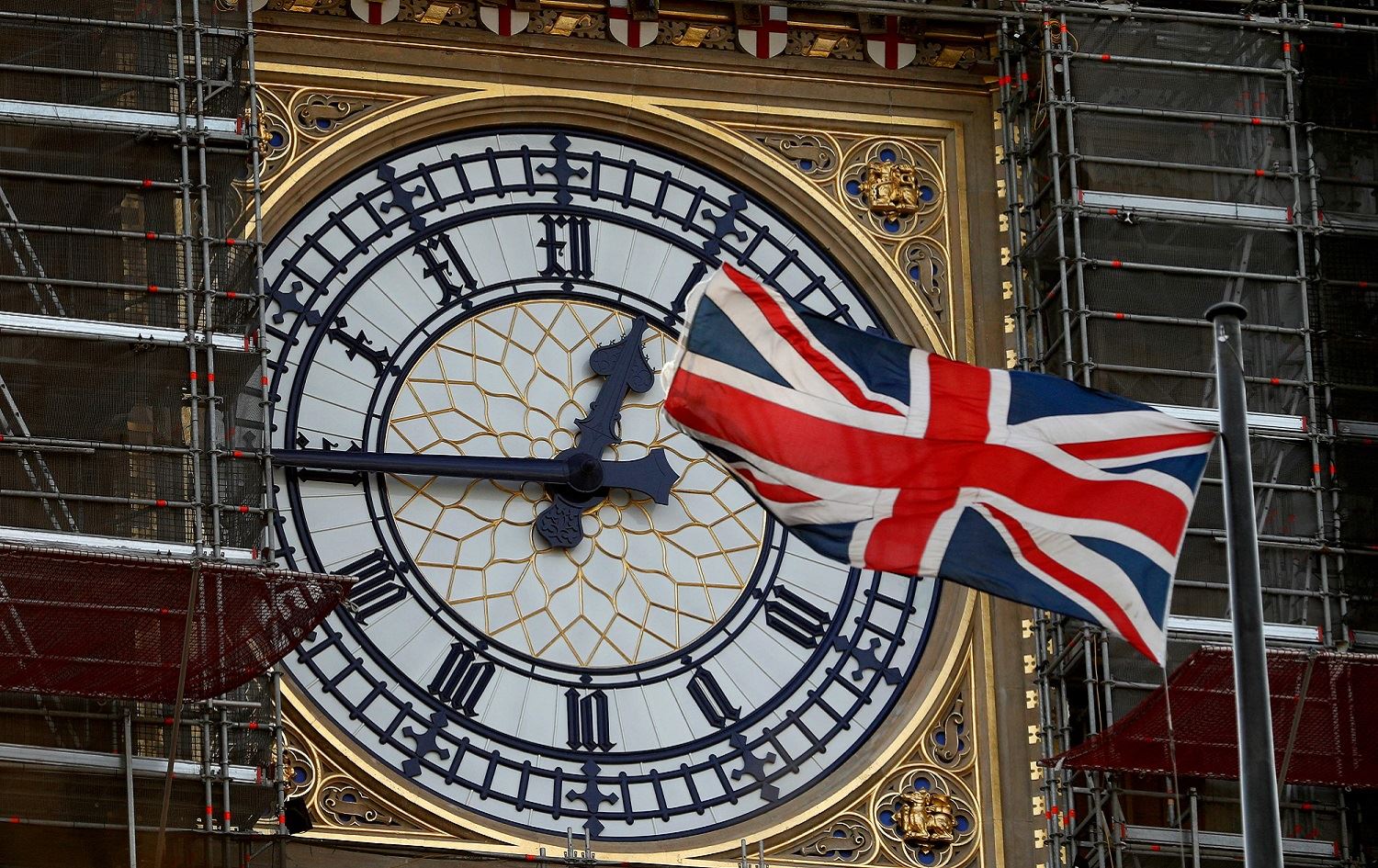 The Union flag flutters near the clockface of Big Ben during ongoing renovations to the Tower and the Houses of Parliament in central London, January 7, 2020. Photo: Adrian Dennis / AFP