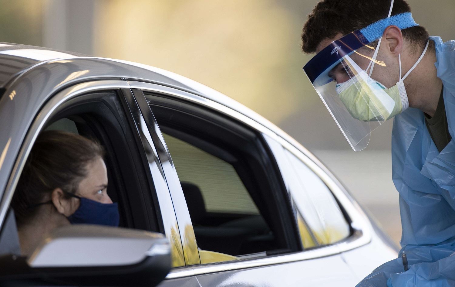 A member of the Tennessee National Guard speaks with a woman at a coronavirus drive thru testing site on April 18, 2020 in Springfield, Tennessee. Photo: Brett Carlsen/Getty Images/AFP