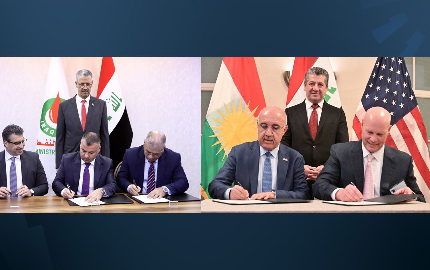 Signing of Iraq and BP agreement on March 10, 2025 [left] and signing of KRG's deals with two American firms on May 19, 2025 [right]. Graphic: Rudaw