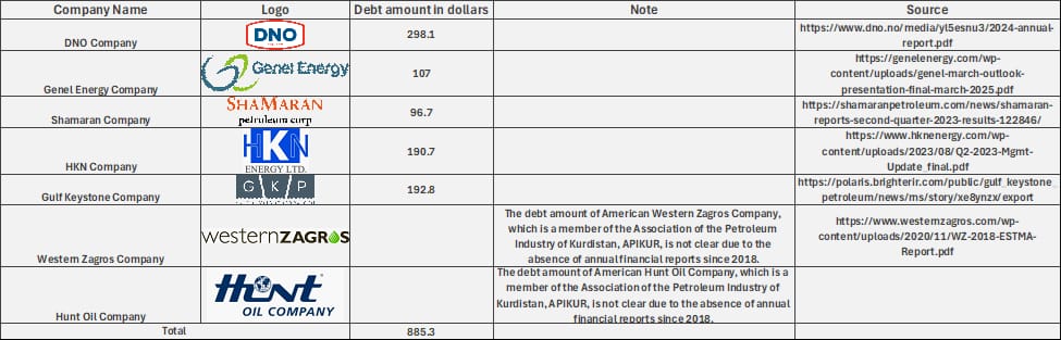 The first concerns the unresolved debts owed to international oil companies (IOCs) operating in the Kurdistan Region. According to their own reports, the outstanding amount for five companies exceeds $885 million, as shown in the table below.