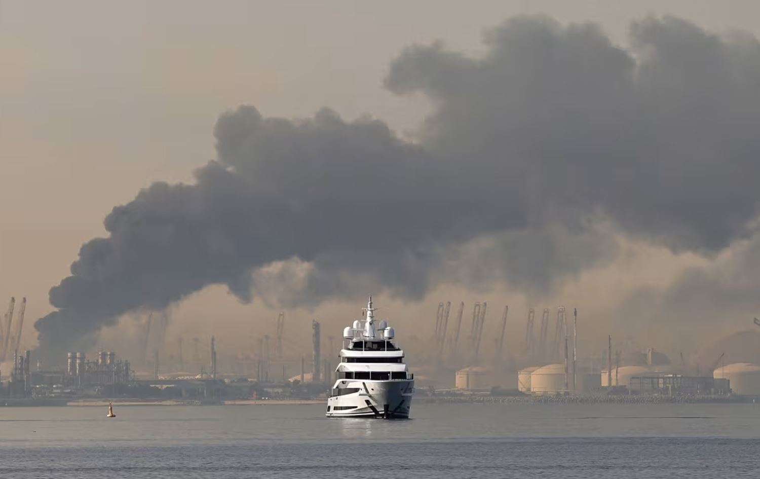 A yacht sails past a plume of smoke rising from the port of Jebel Ali following a reported Iranian strike in Dubai on March 1, 2026. Photo: Fadel Senna / AFP