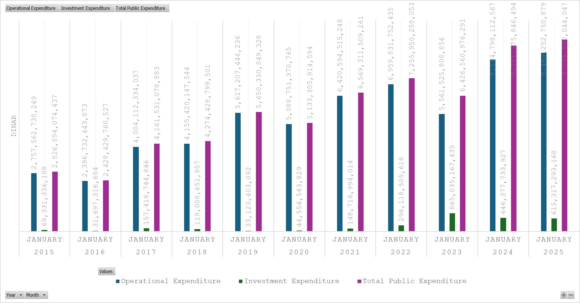 Rising spending commitments, expanding government functions, proliferating public institutions, and oil revenue distribution have driven a sharp increase in Iraq's operational spending over the past decade. Operational spending rose from approximately 2.75 trillion dinars in January 2015 to 5 trillion dinars in January 2020, climbing further to 8.46 trillion dinars in January 2025.