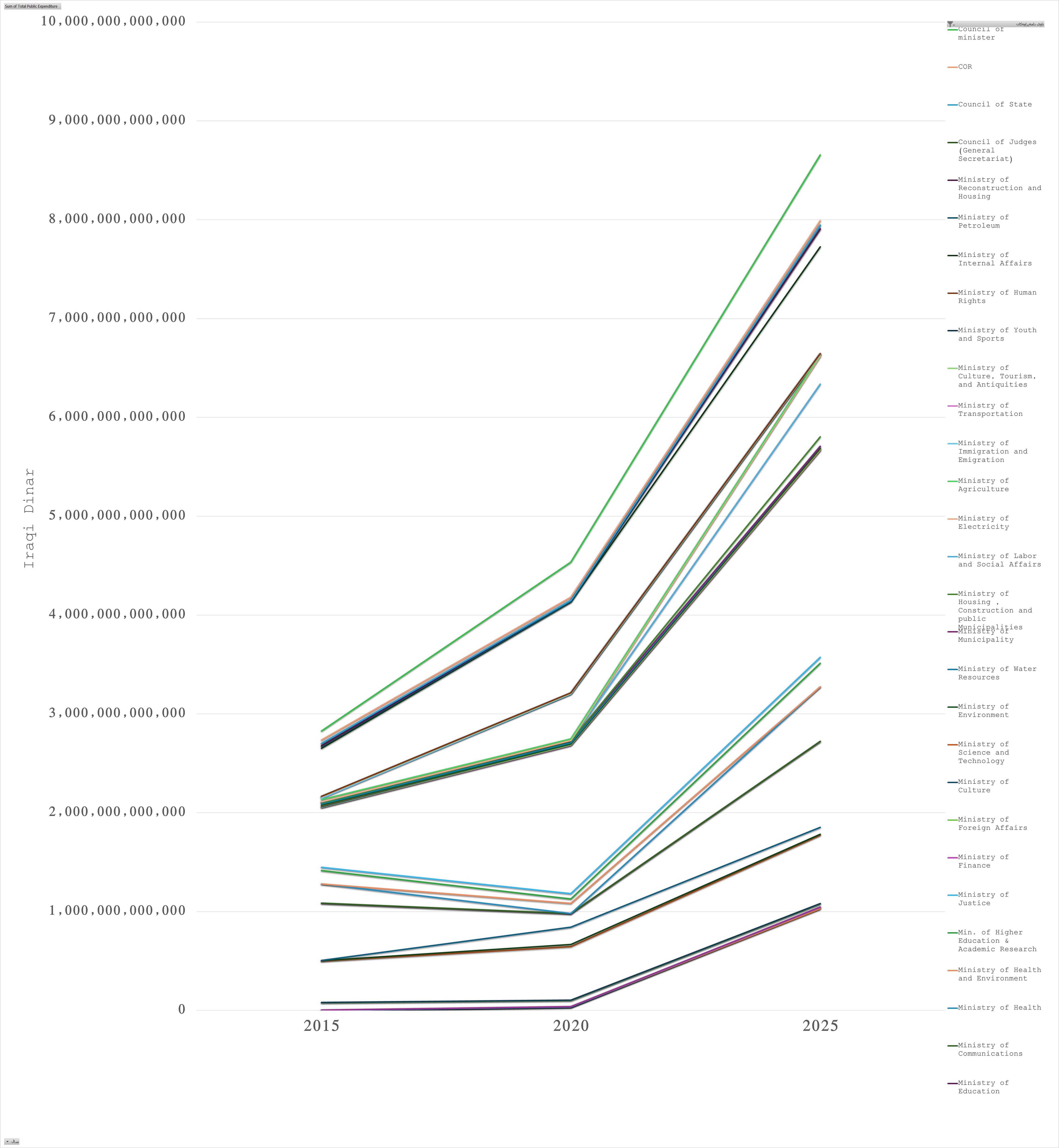 Spending by government entities and ministries in Iraq, 2015, 2020, and 2025 (first month of each year).