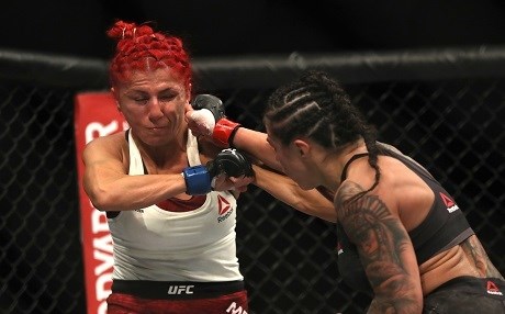 Claudia Gadelha of Brazil (right) punches Randa Markos, an Iraqi Canadian Chaldean, during their UFC 239 Women’s strawweight bout at T-Mobile Arena on July 6, 2019 in Las Vegas, Nevada. Photo: Sean M. Haffey | AFP