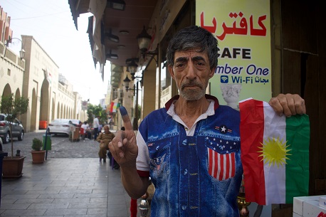 Sangar Saleh from Erbil, age 32: “Everyone is happy to vote 'Yes' for a free Kurdistan.” Saleh said he doesn’t feel threatened by rhetoric from Iran and Turkey. “If there are any problems, [President] Barzani will protect the Kurdish people.”