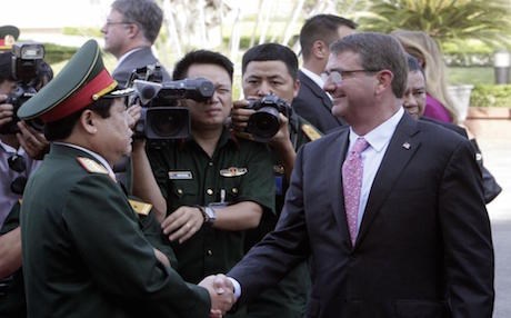 U.S. Defense Secretary Ash Carter, right, shakes hands with his Vietnamese counterpart Gen. Phung Quang Thanh before their talks behind closed doors in Hanoi, Vietnam Monday, June 1, 2015. Carter is on a three-day visit to Vietnam to deepen military cooperation between the two former foes — AP Photo.