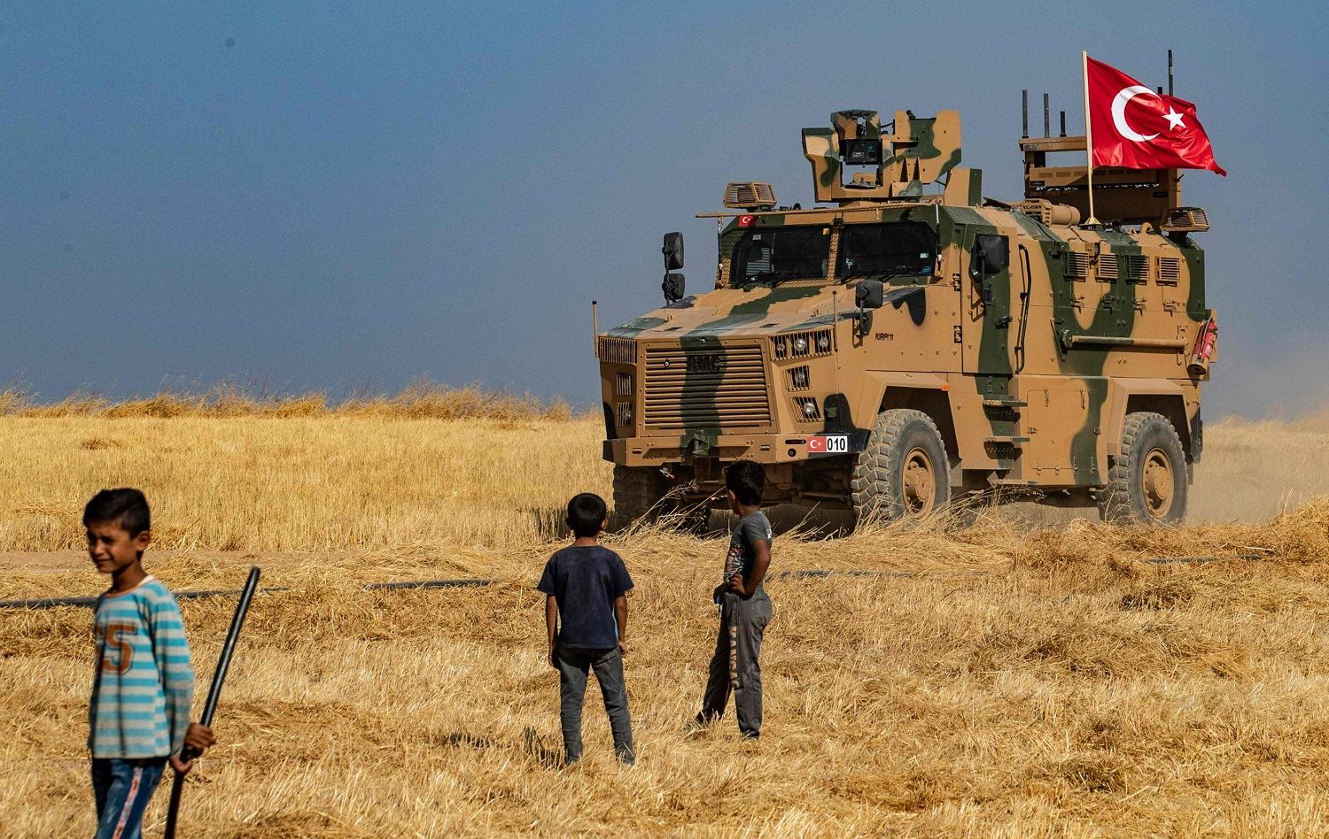 Syrian boys watch as a Turkish military vehicle patrols along the outskirts of Tal Abyad town near the border with Turkey, October 4. Photo: AFP