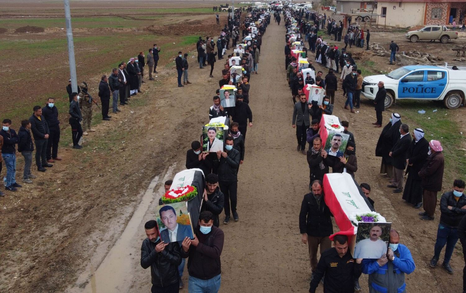 Mourners carry coffins wrapped in the Iraqi flag during a mass funeral for victims of the Yazidi genocide on February 6, 2021 in Shingal. Photo: AFP