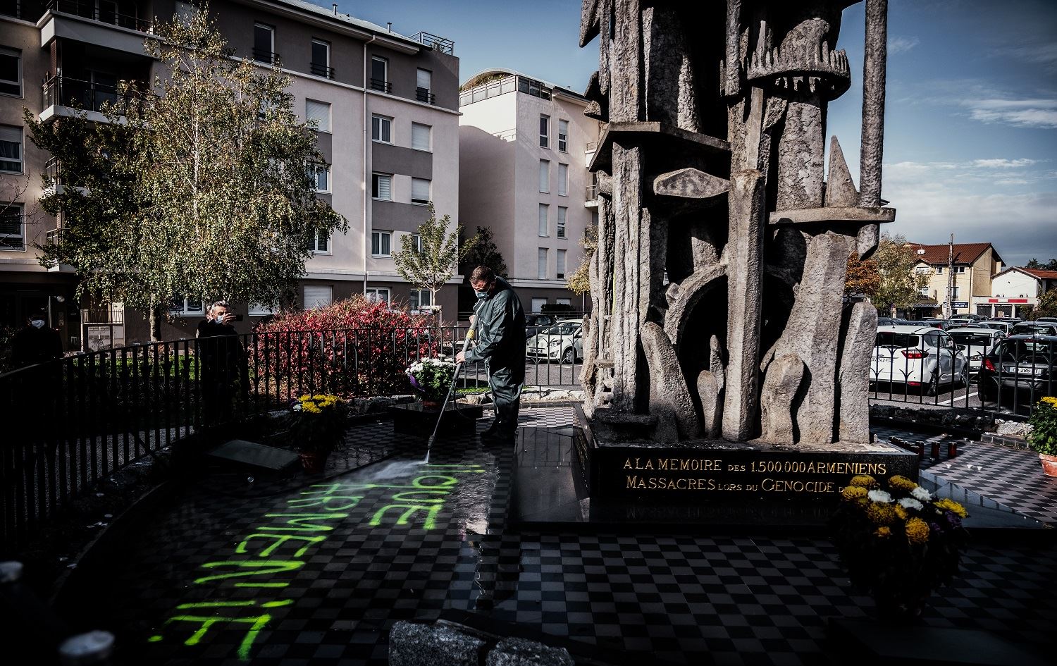 A man cleans the memorial for the Armenian genocide in Decines-Charpieu, near Lyon, on November 1, 2020. Photo: Jeff Pachoud/AFP