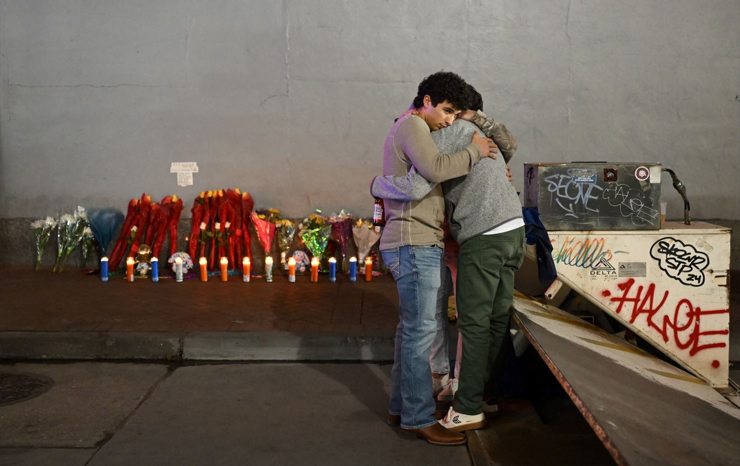 People react at a memorial set up on January 2, 2025 in New Orleans, Louisiana, the day after an attack by a man driving a truck down Bourbon street in the French Quarter. Photo: Andrew Caballero-Reynolds/AFP