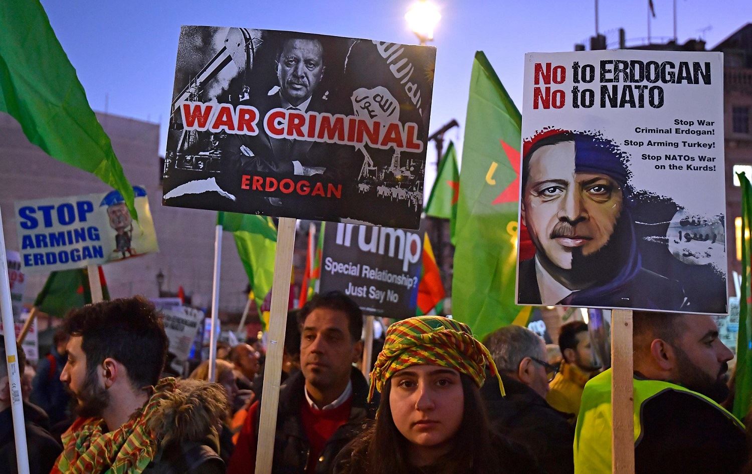 Protesters hold up placards against Turkey's President Recep Tayyip Erdogan as they gather in Trafalgar Square for a demonstration against US President Donald Trump and the NATO alliance in central London, December 3, 2019. Photo: Tobias Schwarz / AFP