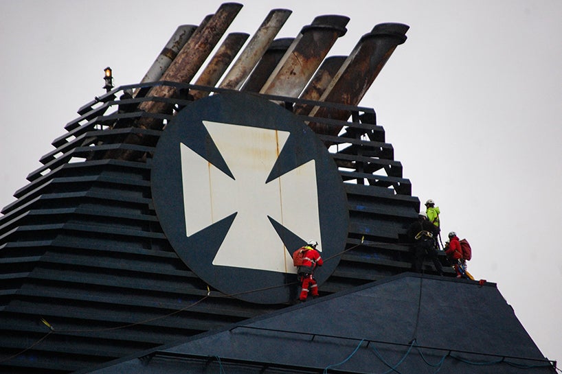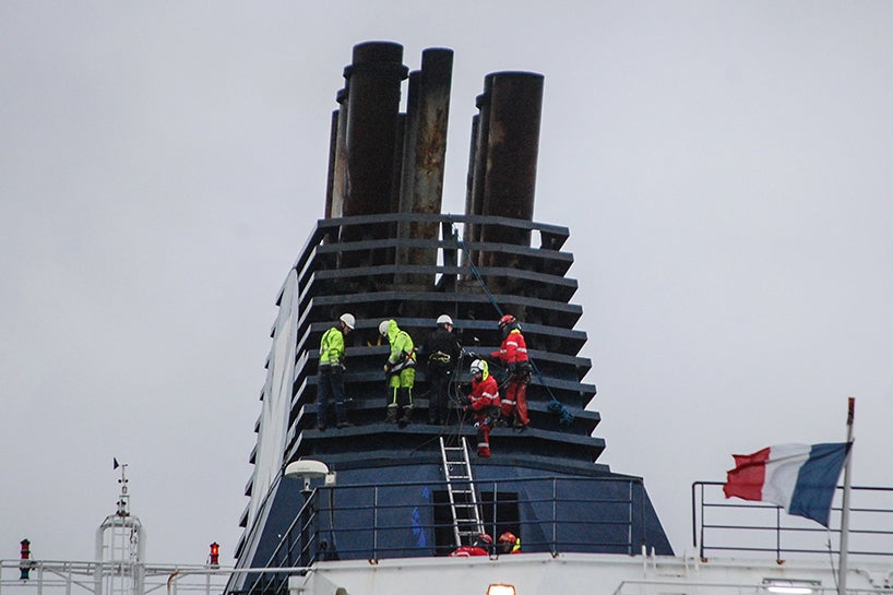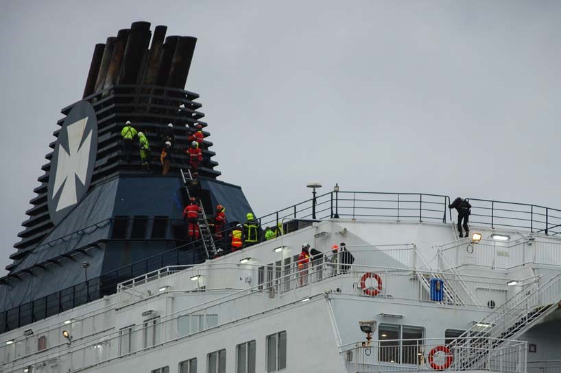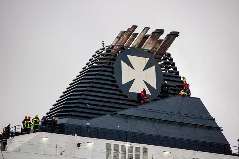 On Sunday morning, firemen talked down the last group of about a dozen migrants who had climbed high above the deck to a catwalk attached to the ship's funnel.