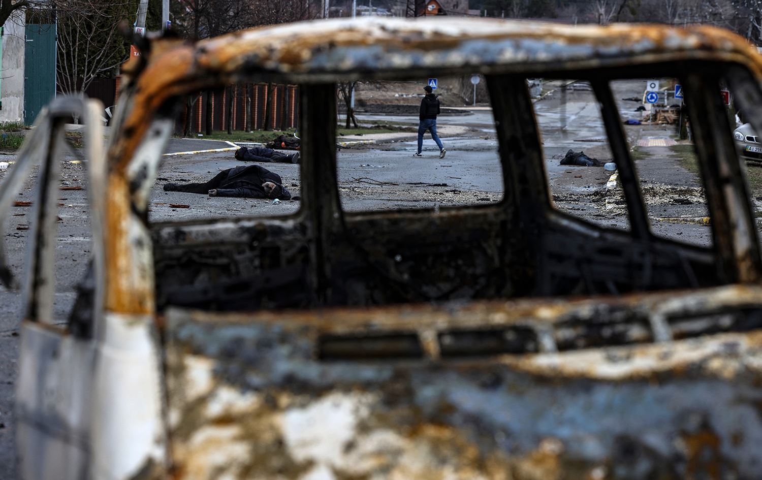 A man walks on a street with several dead bodies on the ground a street in Bucha, northwest of Kyiv, on April 2, 2022. Photo: Ronaldo Schemidt/AFP