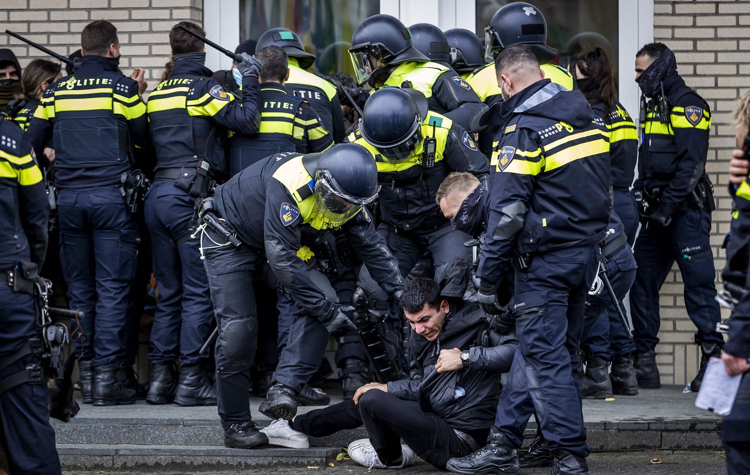 Policemen detain a man after a group of protesters near the premises of the Organization for the Prohibition of Chemical Weapons (OPCW) in The Hague, on December 3, 2021. Photo by Sem van der Wal / ANP / AFP.