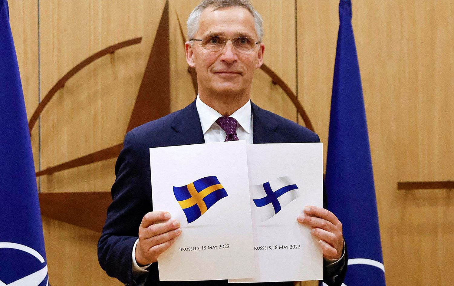 NATO Secretary-General Jens Stoltenberg hailing the historical moment of Sweden and Finland applying for membership. Photo: Johanna Geron/AFP