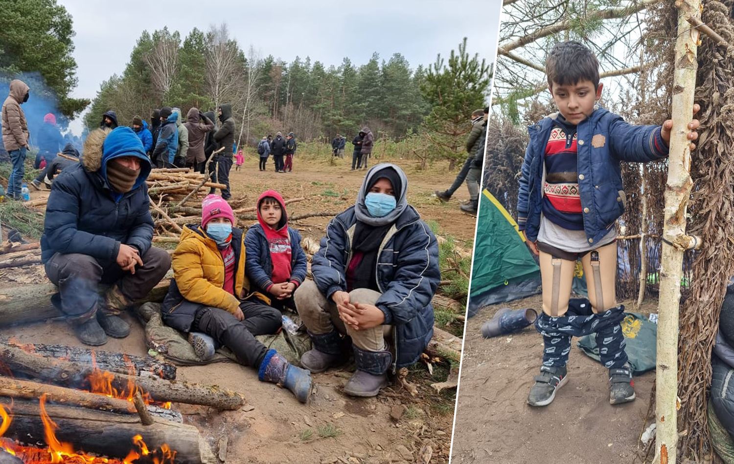 From left: Taman (third from left) and his family in a forest on Belarus-Poland border, and Taman shows his prosthetic legs in the same place in November 2021.