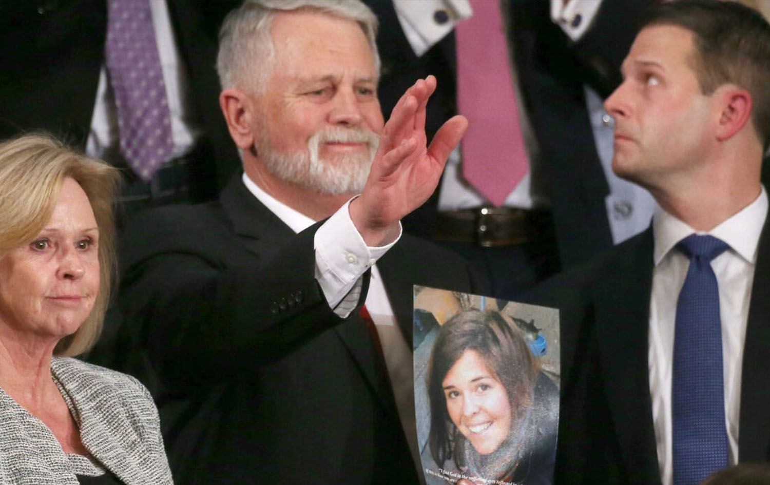 Carl Mueller (center) holds a photo of his daughter, Kayla, as his wife Marsha (left) looks on during the 2020 State of the Union address. Photo: AFP