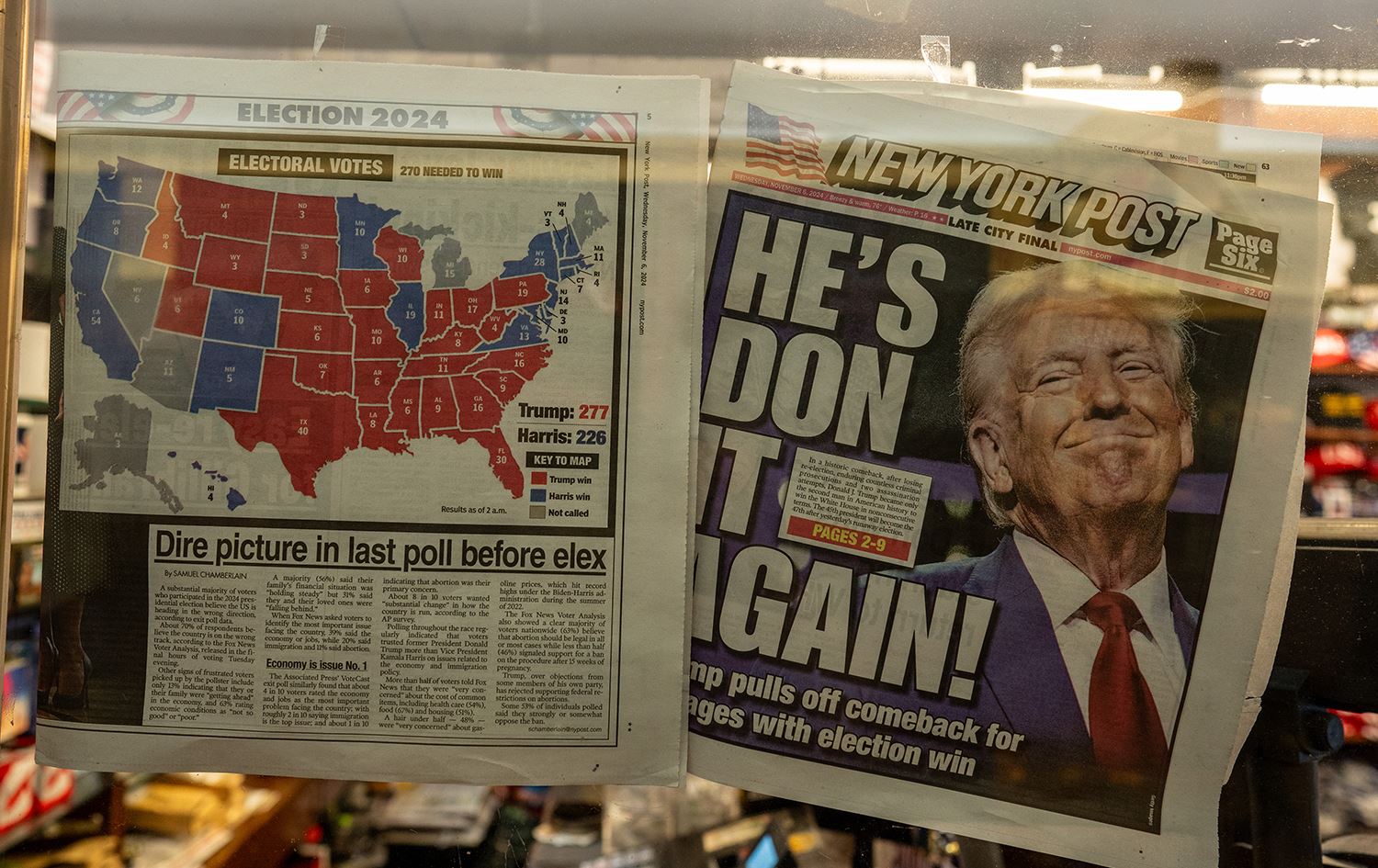 The New York Post is displayed in the window of a newsstand inside of Trump Tower in New York City, November 6, 2024. Photo: AFP/David Dee Delgado