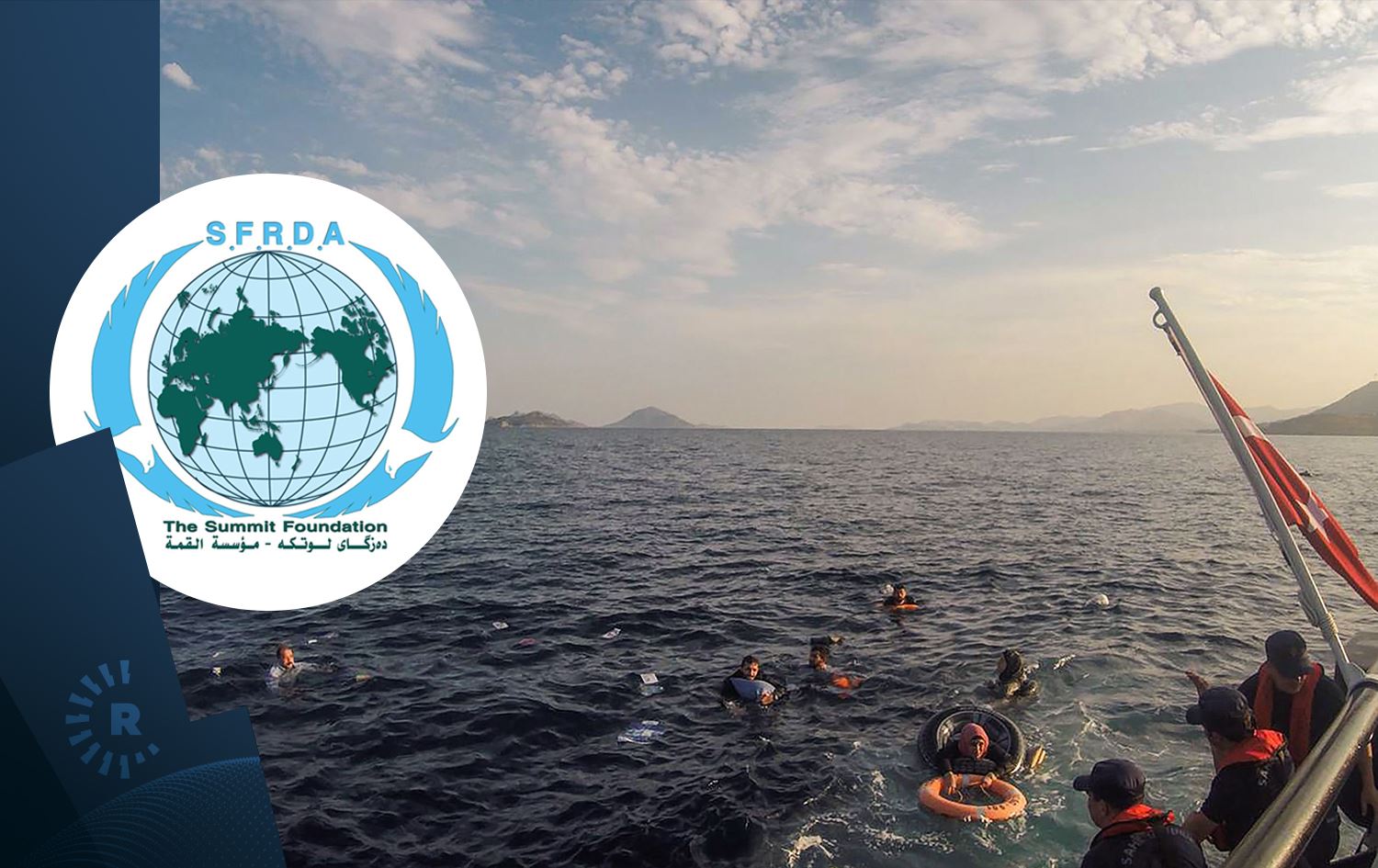 Logo of Summit (Lutka) Foundation for Refugee and Displaced Affairs (left). Migrants being rescued (right) after their boat sank in the Aegean Sea on June 17, 2019. Photo: AFP; Graphic: Rudaw