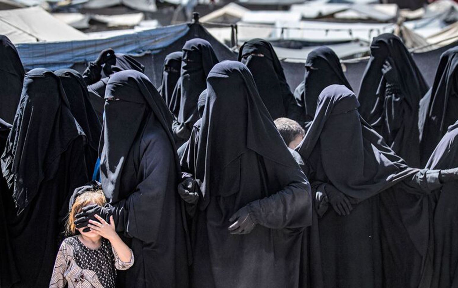 Women and a child queue to receive humanitarian aid packages at the Kurdish-run al-Hol camp, which holds relatives of suspected Islamic State fighters, in Syria's northeastern Hasakeh governorate on August 18, 2021. Photo: Delil Souleiman/AFP