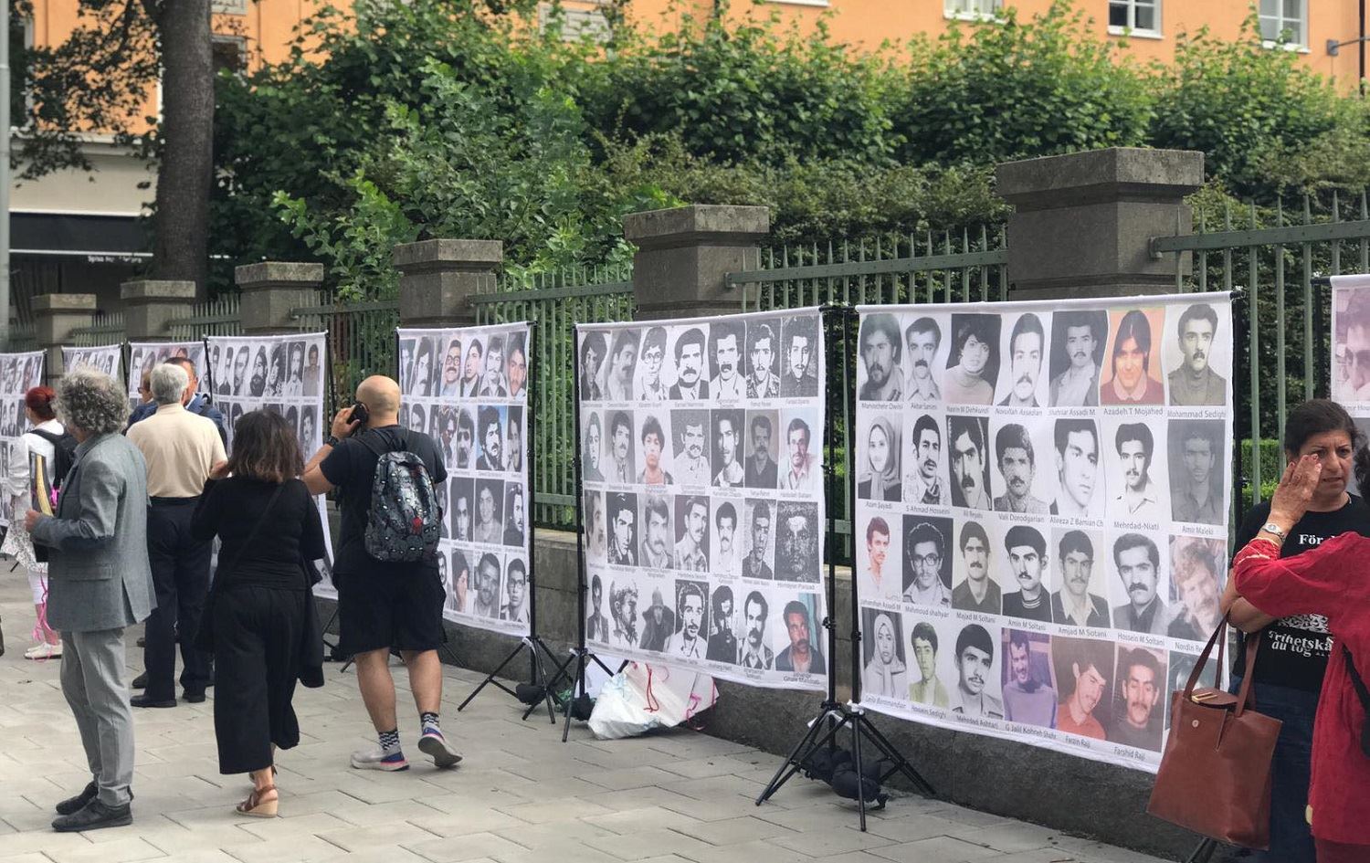 Photos of victims of Iran's 1988 prison massacre are displayed outside a Stockholm court house on August 10, 2021 where an Iranian national is on trial for war crimes in connection with the executions. Photo: Rebin Rahmani