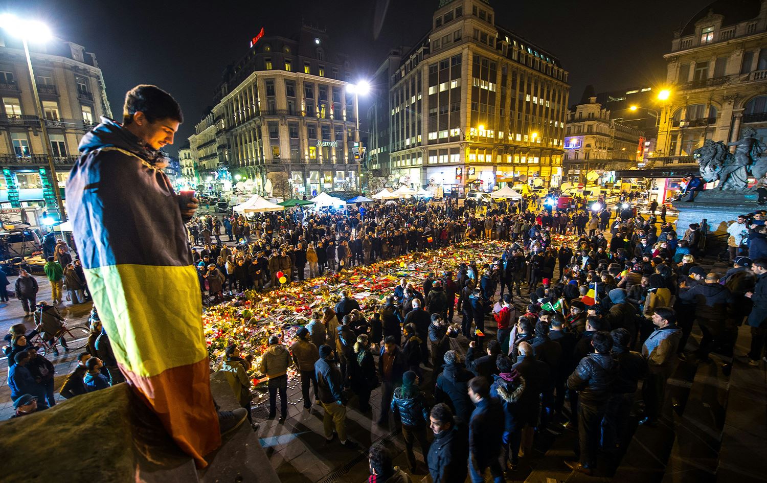 Throughout the day, hundreds of people gather on the Place de la Bourse in the historic old town centre of Brussels to leave flowers, candles and messages.