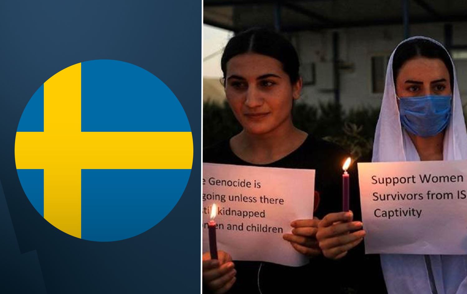Swedish flag (left) Yazidi women commemorate the 2014 genocide by ISIS in Duhok in 2020 (right). Photo: AFP. Graphic: Rudaw