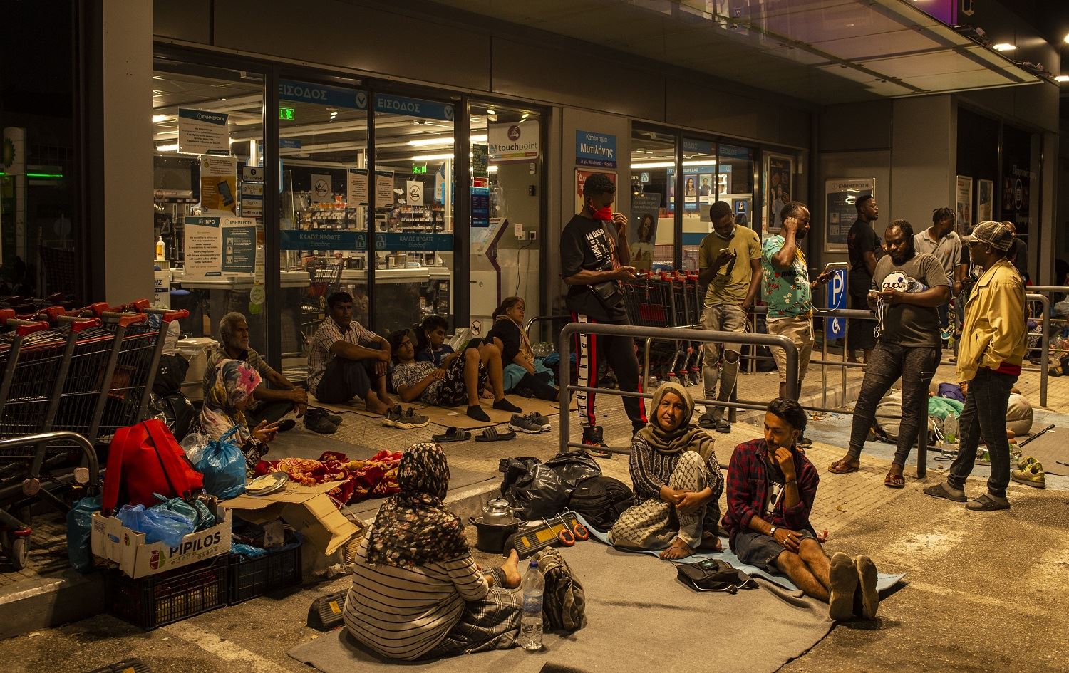 Migrants sit outside a supermarket on the side of a road on September 10, 2020 in Lesbos. Photo: Angelos Tzortzinis / AFP