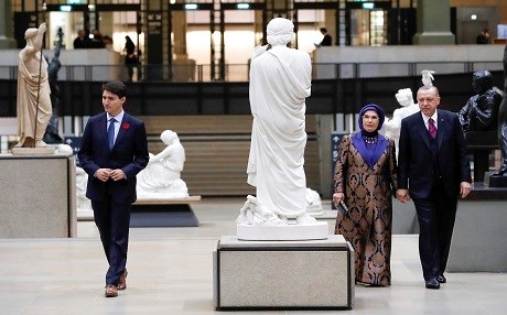 Canadian PM Justin Trudeau (left) and Turkish President Recep Tayyip Erdogan (right) and his wife Emine Erdogan walk in the Musee d'Orsay in Paris on November 10, 2018 to attend a state diner and a visit of the Picasso exhibition as part of ceremonies marking the 100th anniversary of the 11 November 1918 armistice, ending World War I. Photo: Ian Langsdon | AFP