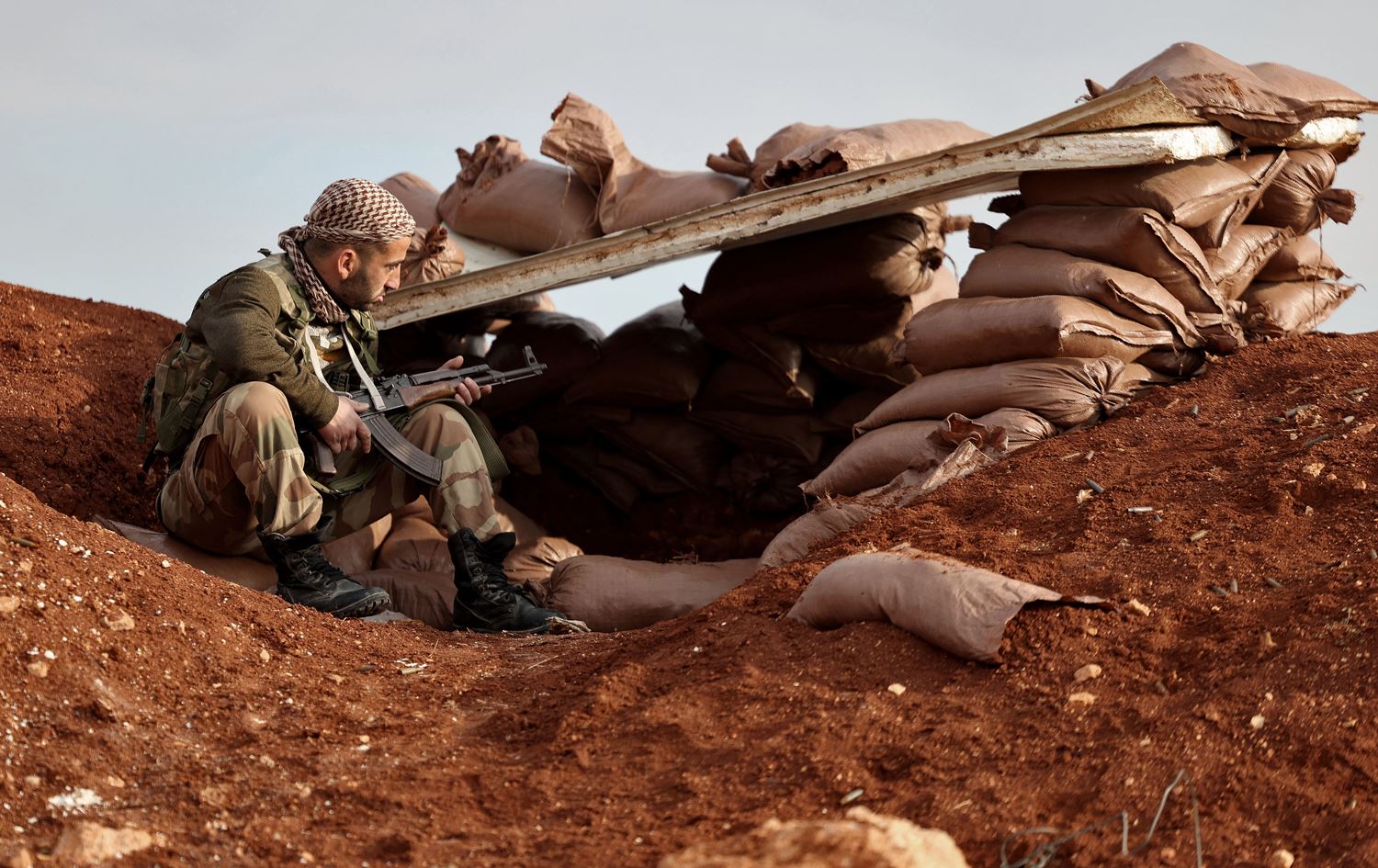A Turkey-backed Syrian fighter sits at a position on the outskirts of the town of Marea, in the northern Aleppo countryside, along the frontline with areas held by the US-backed Kurdish-Arab alliance known as the Syrian Democratic Forces (SDF), on December 6, 2022. Photo: Omar Haj Kadour/AFP
