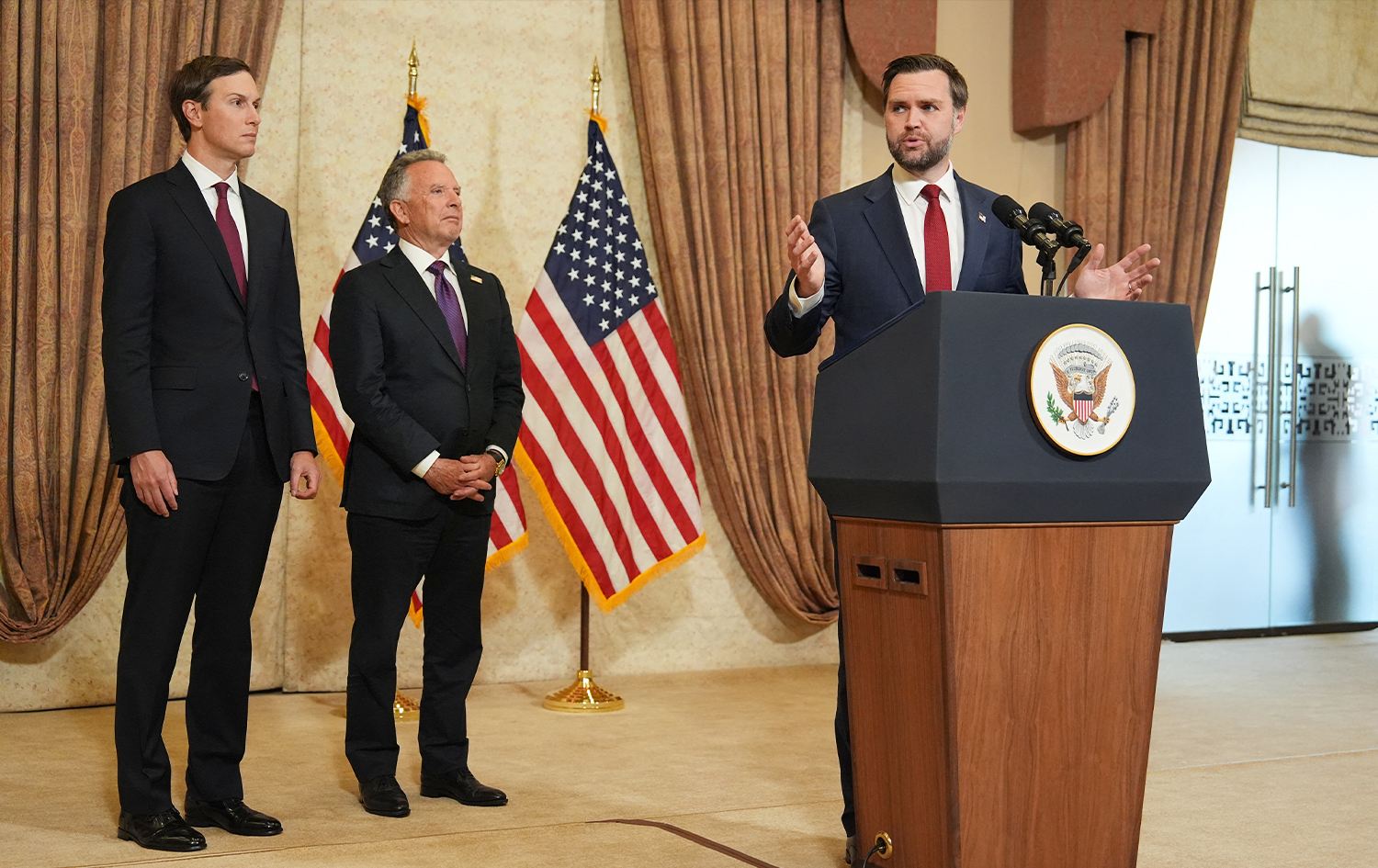 US Vice President JD Vance (right) speaks during a news conference as US President Donald Trump's son-in-law Jared Kushner (left) and US Special Envoy to the Middle East Steve Witkoff (center) watch, in Islamabad on April 12, 2026. Photo: Jacquelyn Martin / Pool / AFP