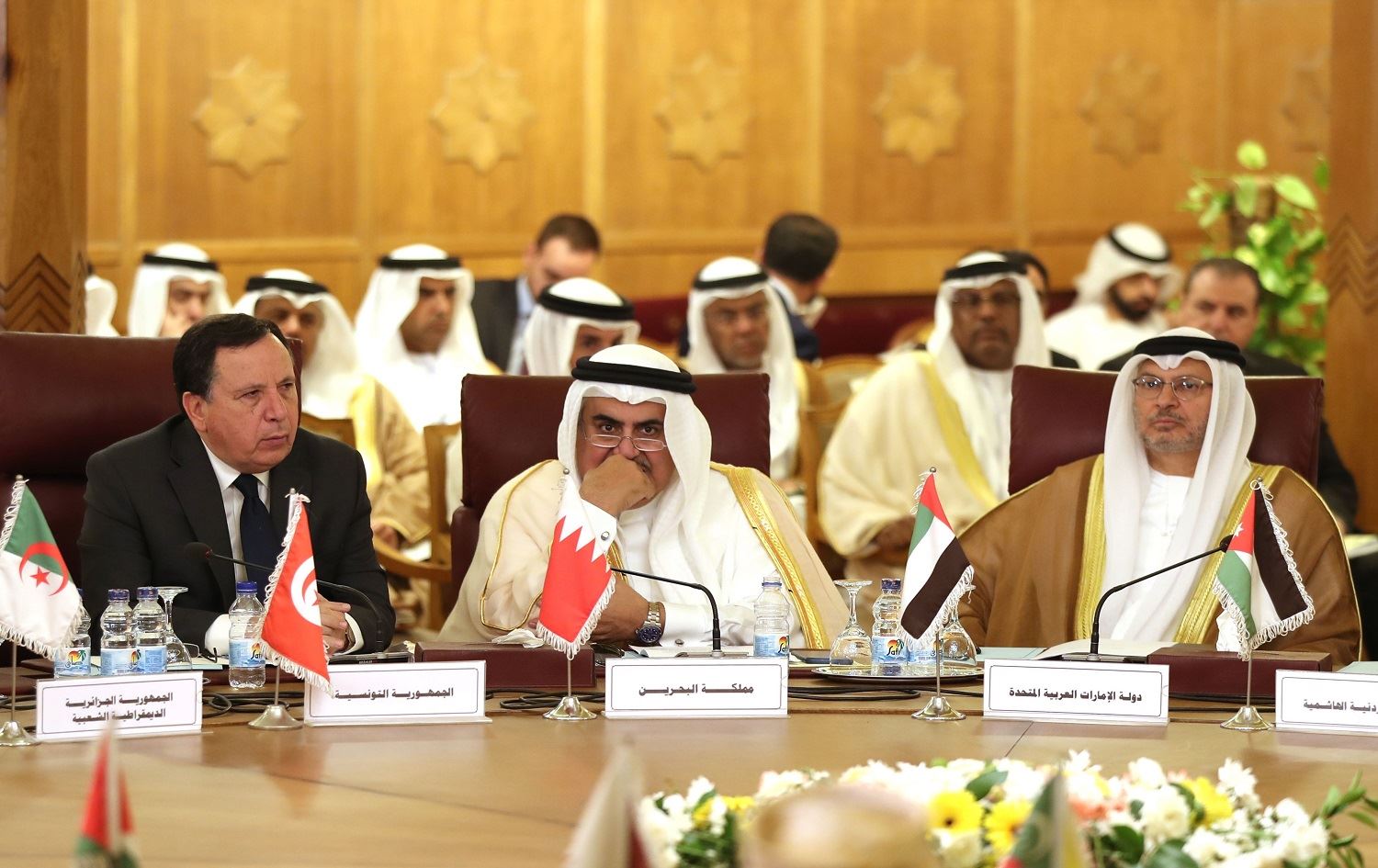 Tunisian Foreign Minister Khemaies Jhinaoui, Bahrain Foreign Minister Khalid Ben Ahmed al-Khalifah and Emirati minister of state for foreign affairs Anwar Gargash attend an emergency foreign ministers meeting at the Arab League headquarters in Cairo on October 12, 2019. Photo: AFP / Mohamed el-Shahed