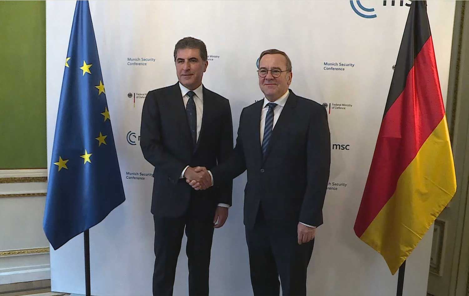 Kurdistan Region President Nechirvan Barzani (left) meets with German Defence Minister Boris Pistorius in Munich on February 12, 2026. Photo: Screengrab/Rudaw