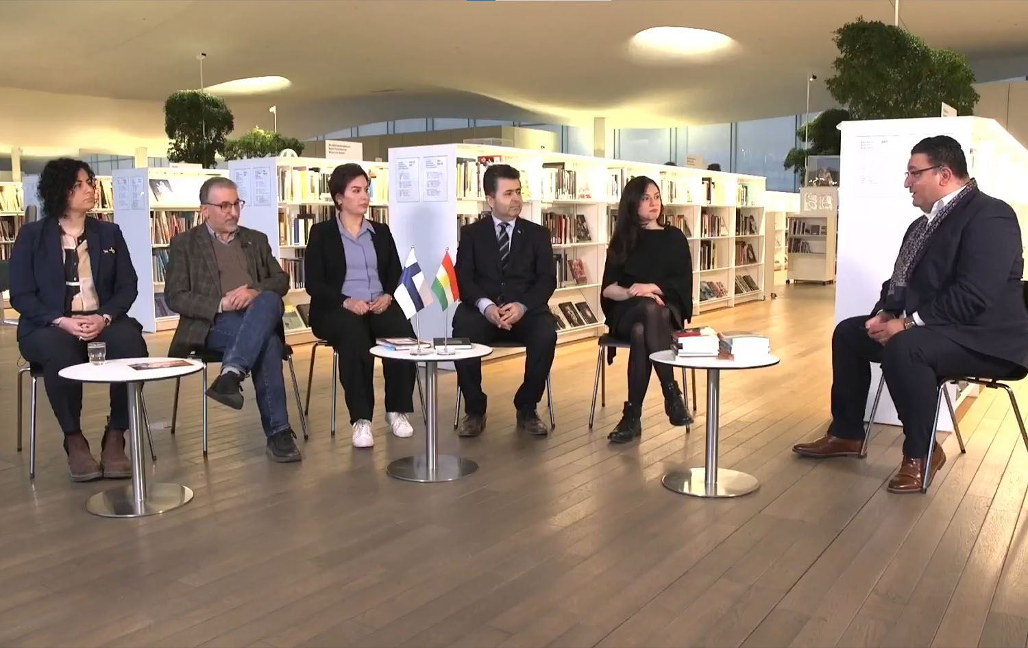 From left: Shayda Sohrabi, a candidate for Finland's National Coalition party, Majid Haqqi, an elections and Kurdish diaspora in Finland expert, Shahen Zada Ahmed, a Social Democratic candidate, Welat Nehri, former president of the Federation of Kurdish Associations in Finland, and Shina Rezavi, a refugee affairs and human rights specialist, in a debate with Rudaw's Hemin Abdullah on April 11, 2025. Photo: Rudaw