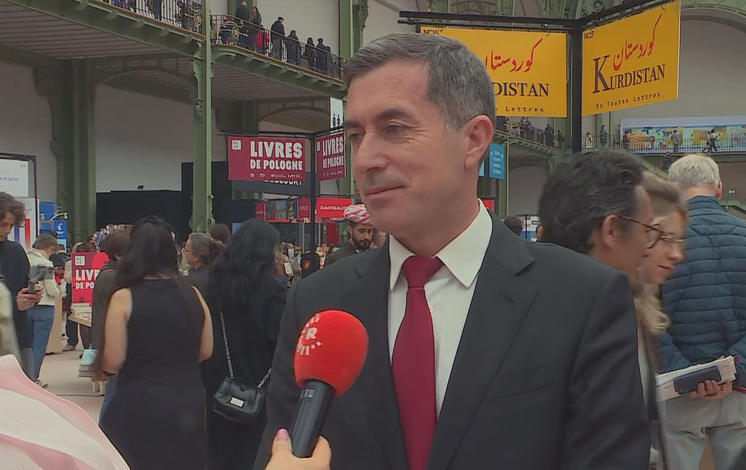 Ali Dolamari, the Kurdistan Regional Government’s (KRG) representative to France, speaking to Rudaw at the Paris Book Fair 2025 next to the Kurdistan book stand on April 13, 2025. Photo: Rudaw