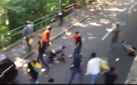 A black Mercedes ploughs through a group of Kurdish demonstrators in Bern. Video from Facebook.