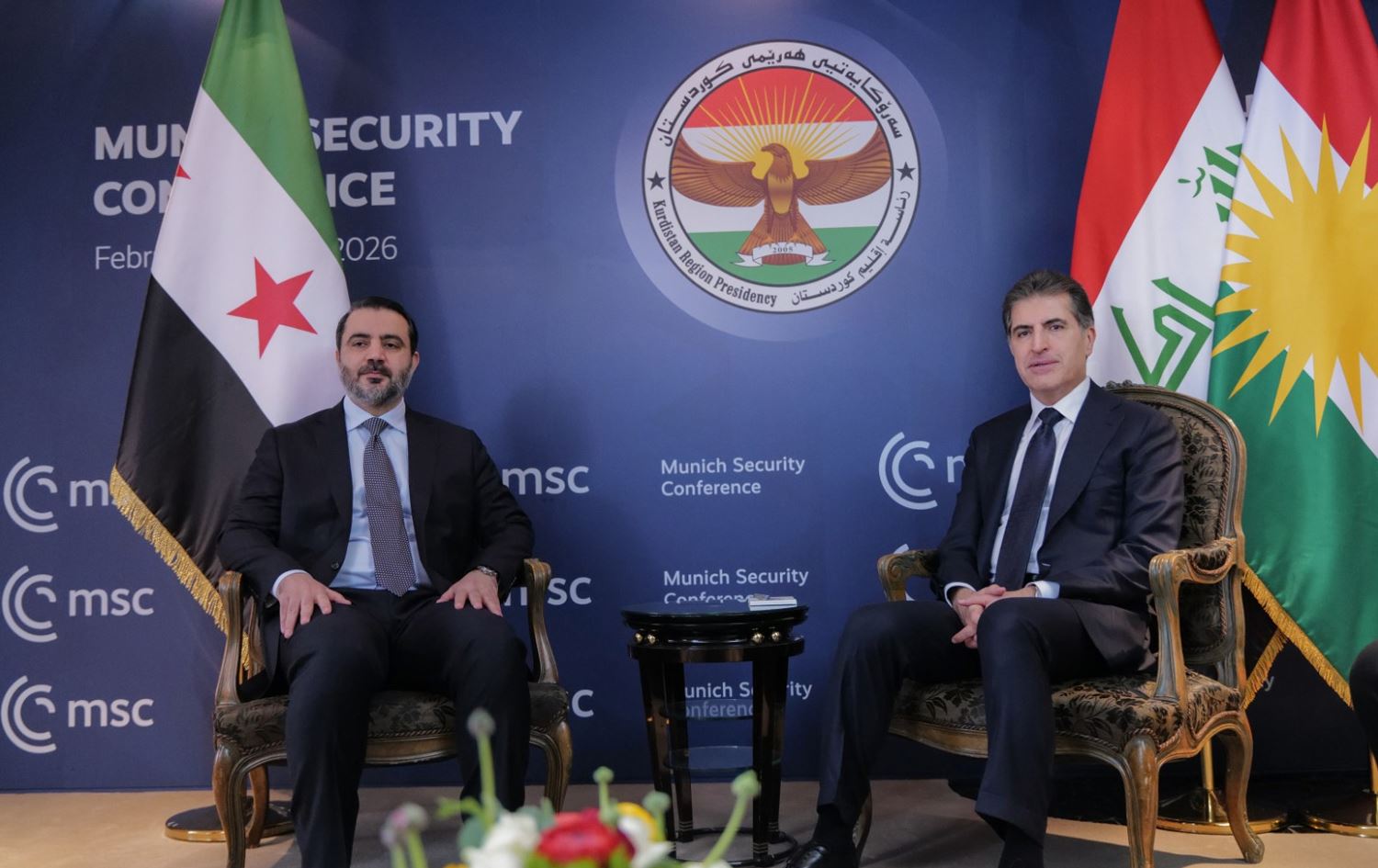 Kurdistan Region President Nechirvan Barzani (right) meets with Syrian interim Foreign Minister Asaad al-Shaibani on the sidelines of the Munich security conference on February 14, 2026. Photo: Kurdistan Region Presidency