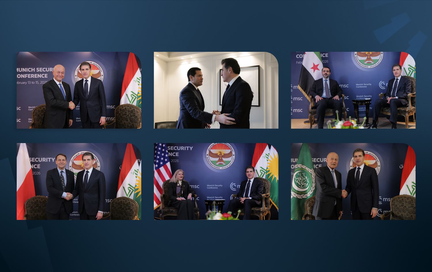 Kurdistan Region President Nechirvan Barzani meets with world leaders on the sidelines of Munich security conference on February 14, 2026. Graphic: Rudaw