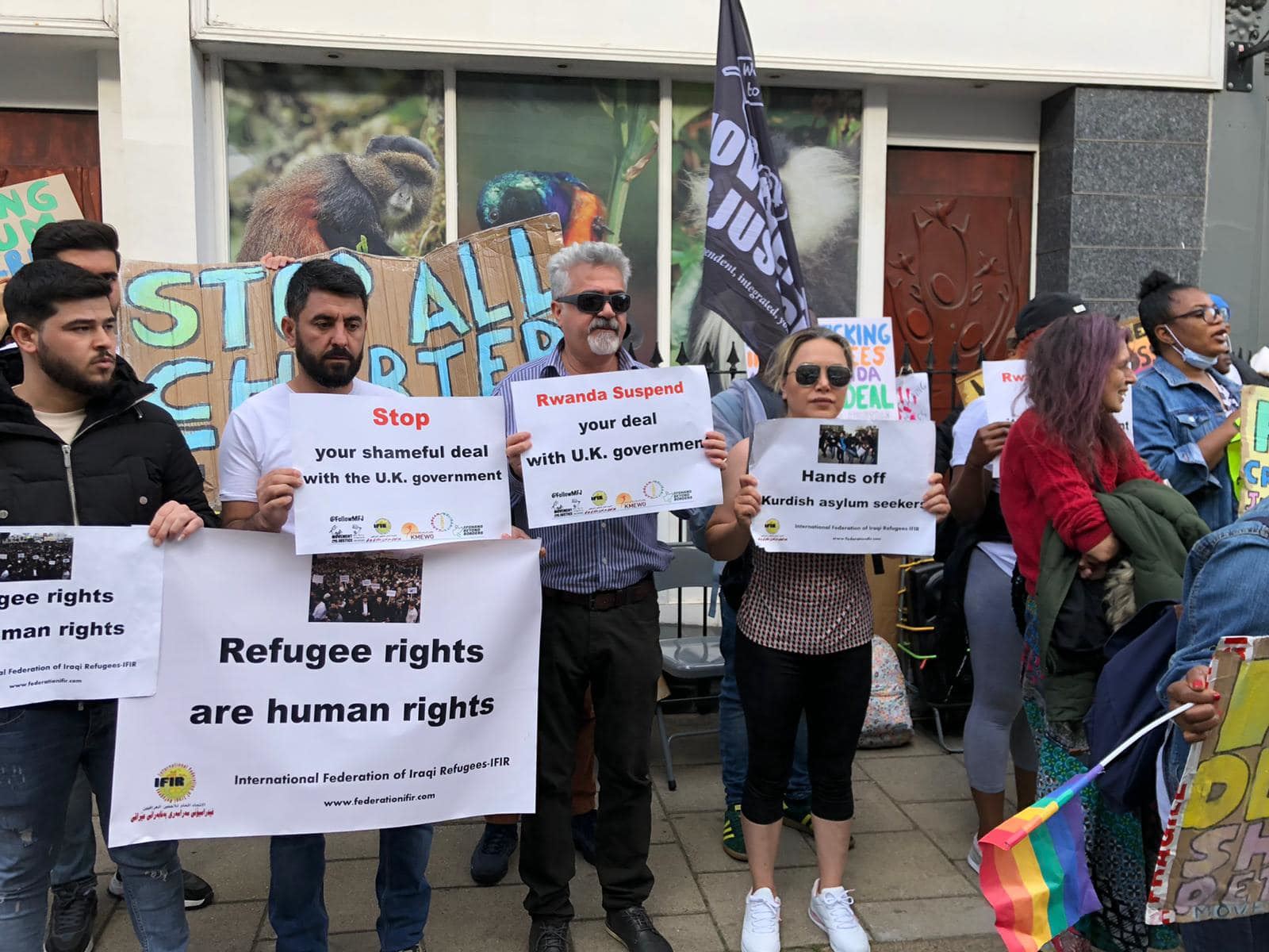Protests in front of the Royal Court of Justice in London against Rwanda plan on June 14, 2022. Photo: IFIR