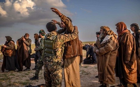 Suspected Islamic State fighters are searched after leaving the last ISIS holdout of Baghouz in Syria, on February 22 ,2019. Photo: AFP