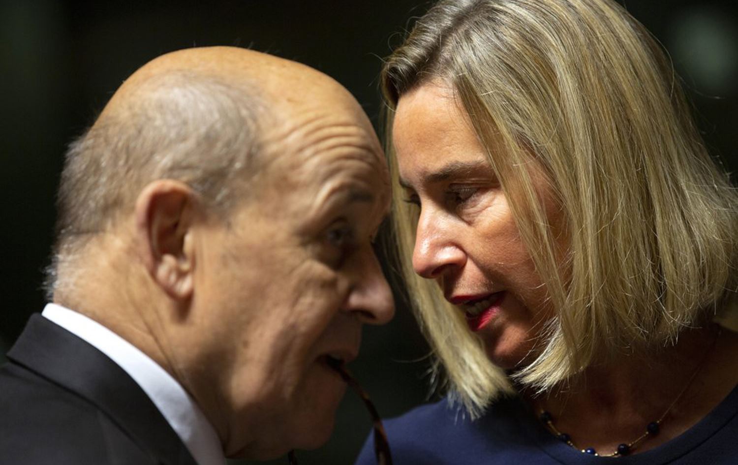 European Union foreign policy chief Federica Mogherini, right, speaks with French Foreign Minister Jean-Yves Le Drian during a meeting of EU foreign ministers at the European Convention Center in Luxembourg, October 14, 2019. Photo: Virginia Mayo / AP