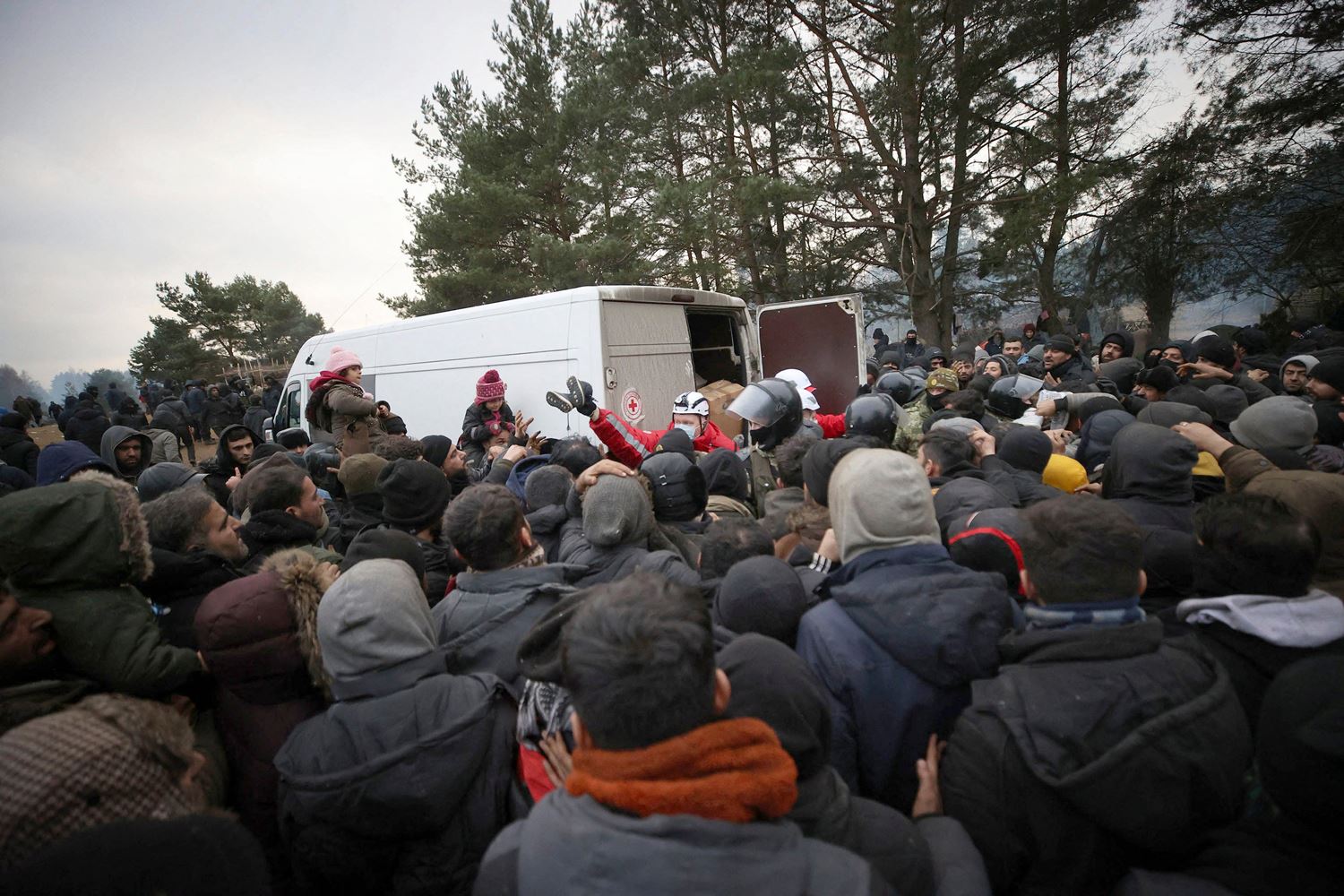 A group of migrants gather to receive humanitarian aid in a camp near the Belarusian-Polish border in the Grodno region on November 13, 2021. Photo: Leonid SHCHEGLOV/AFP