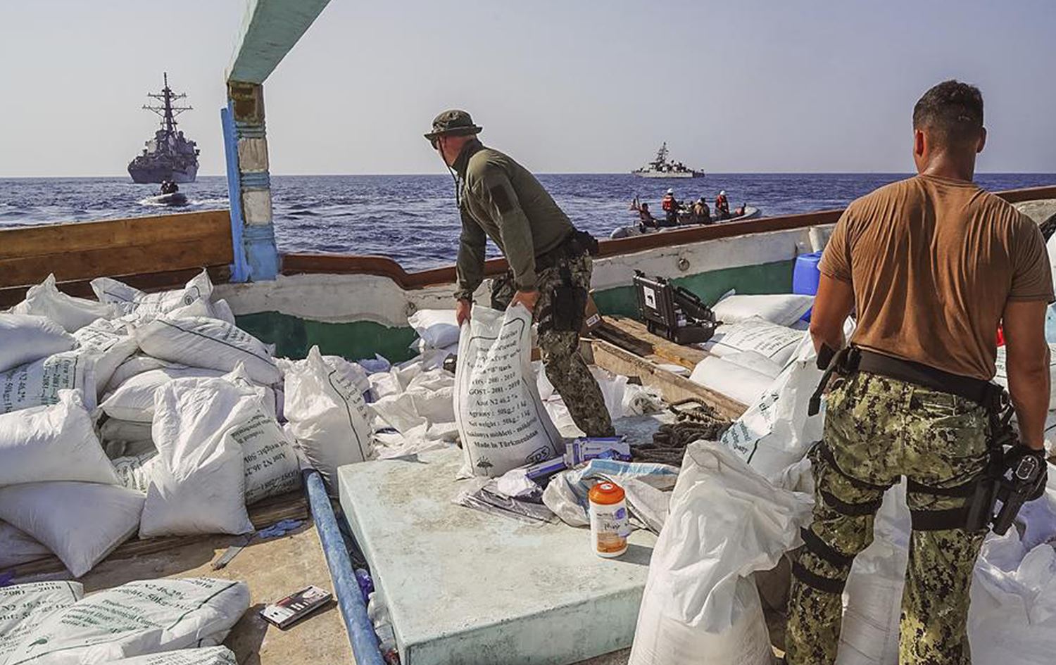 US Navy finds sailors inventory urea and ammonium perchlorate on a dhow intercepted in the Gulf of Oman on Nov. 9, 2022. Photo: Sonar Technician 1st Class Kevin Frus/U.S. Navy/AP