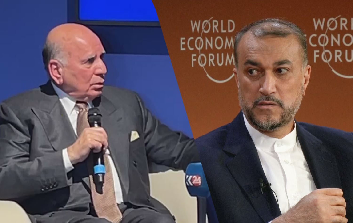 Iraqi Foreign Minister Fuad Hussein (left) and Iranian Foreign Minister Hossein Amir-Abdollahian (right) speaking on the sidelines of the World Economic Forum in Davos, Switzerland on January 17, 2024. Photos: screengrab/AFP