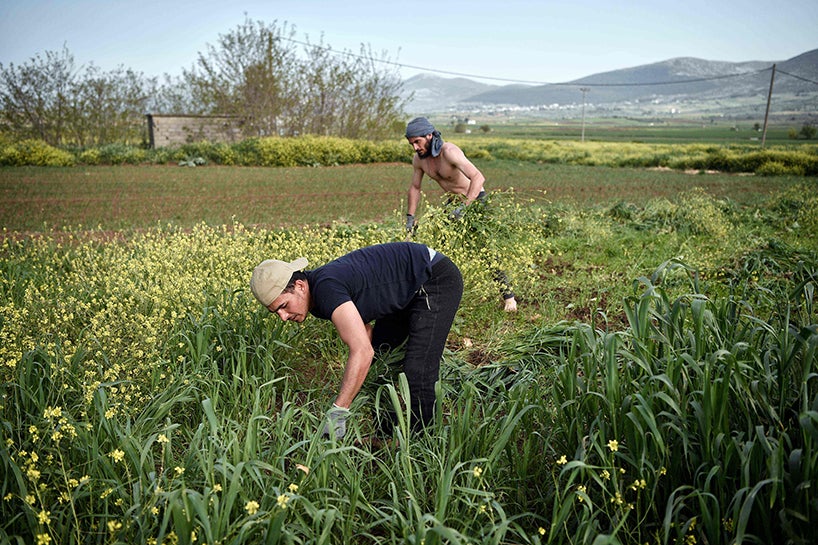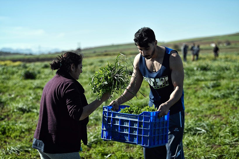 The refugees receive a salary for their work, and local landowners hit hard by the Greek economic crisis also benefit.