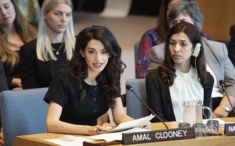Amal Clooney, a barrister, addresses the UN Security Council meeting on women and peace and security, with a focus on sexual violence in conflict on April 23, 2019. At right is Nadia Murad, Nobel Peace Prize Laureate and Goodwill Ambassador for the Dignity of Survivors of Human Trafficking of the United Nations Office on Drugs and Crime. Photo: UN Media Centre
