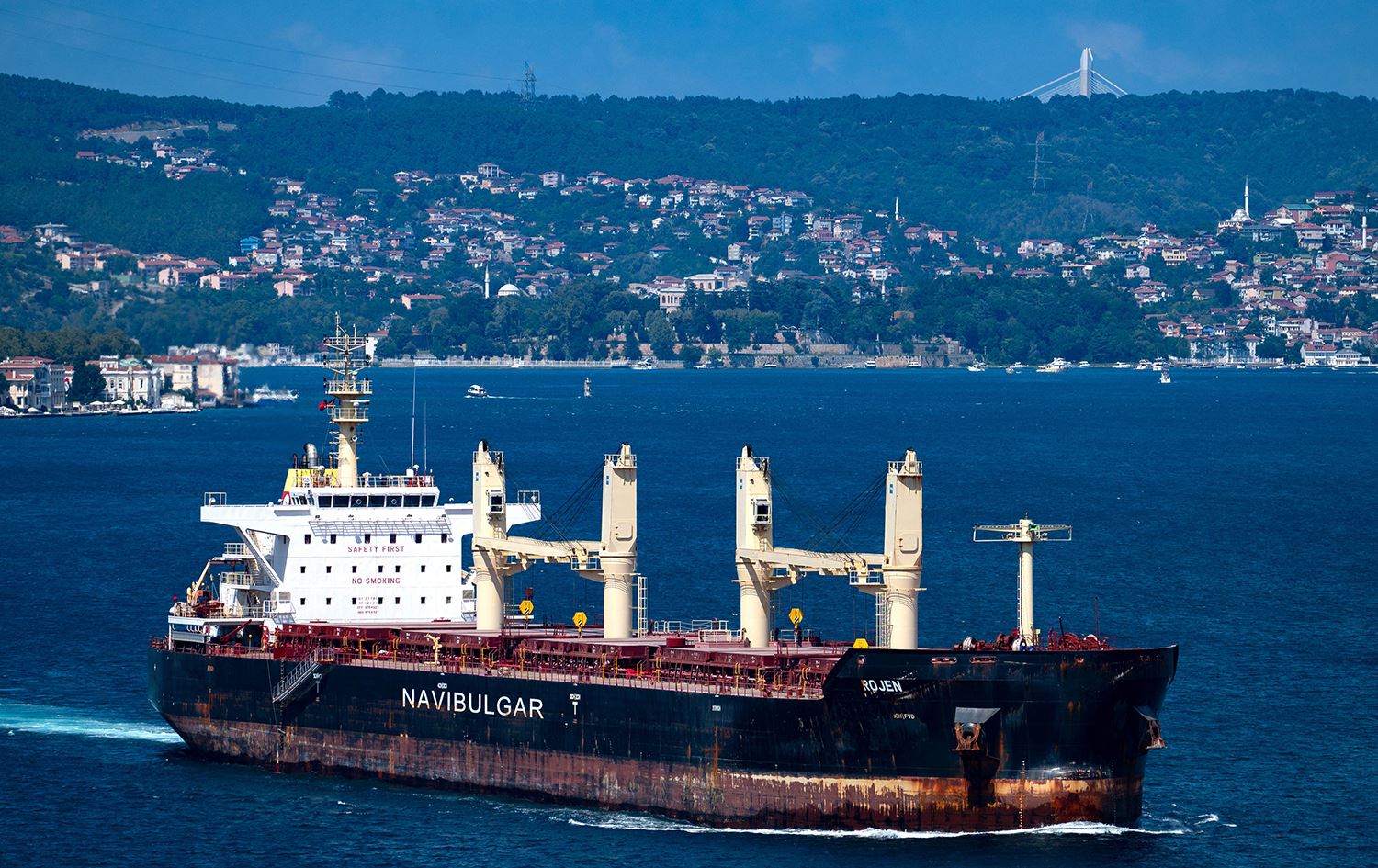 Ukrainian grain ship sails along the Bosphorus Strait in Istanbul, Turkey on August 7, 2022. Photo: Yasin Akgul/AFP