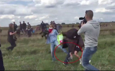 A camerawoman who is in the middle of the chaos is seen tripping the pair, and several others. Laszlo, who worked for an anti-immigration far-right Hungarian TV station, was fired immediately.
