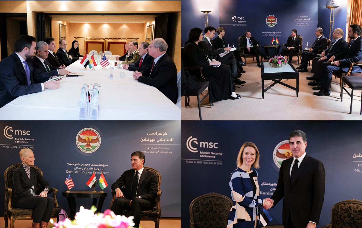 Kurdistan Region President Nechirvan Barzani concluded his participation at the Munich Security Conference by holding more high-profile meetings on February 18, 2024. Photos: Office of the President; Graphic: Rudaw