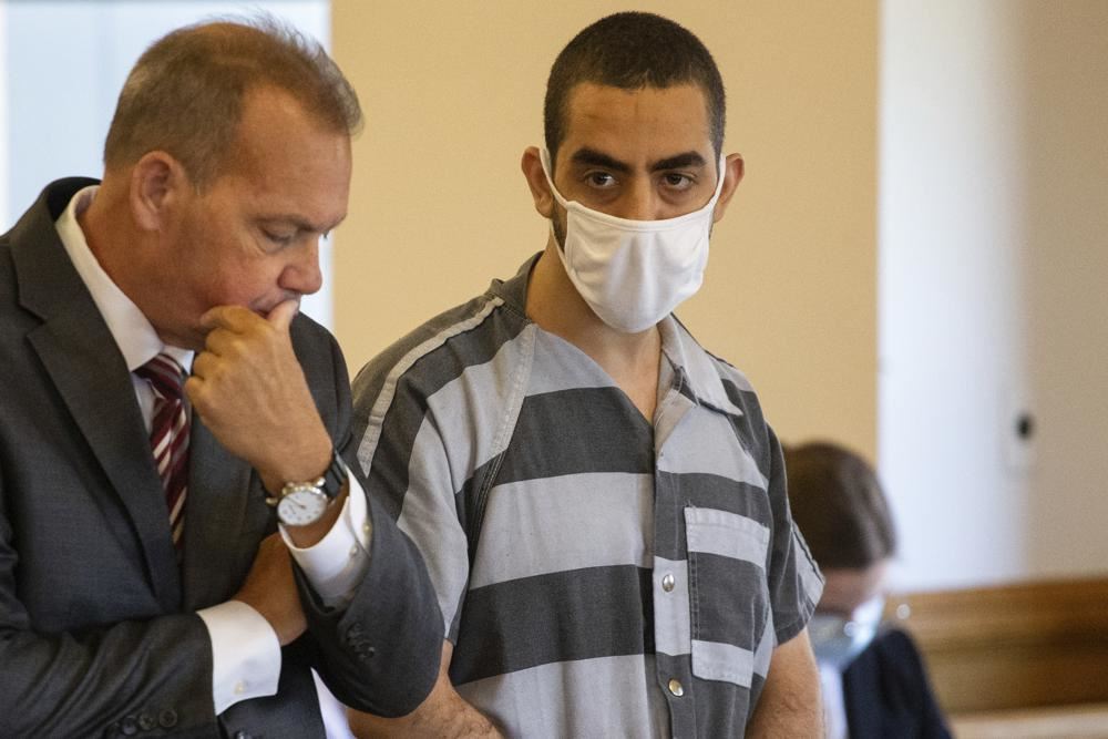 Defense attorney Nathaniel Barone, left, and Hadi Matar, 24, right, listen during an arraignment in the Chautauqua County Courthouse in Mayville, NY., Thursday, Aug. 18, 2022. Photo: AP